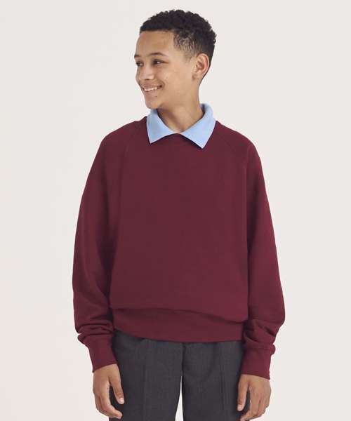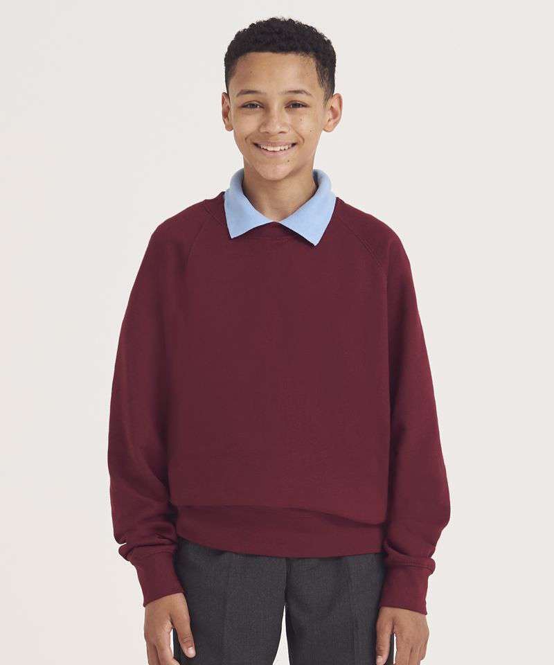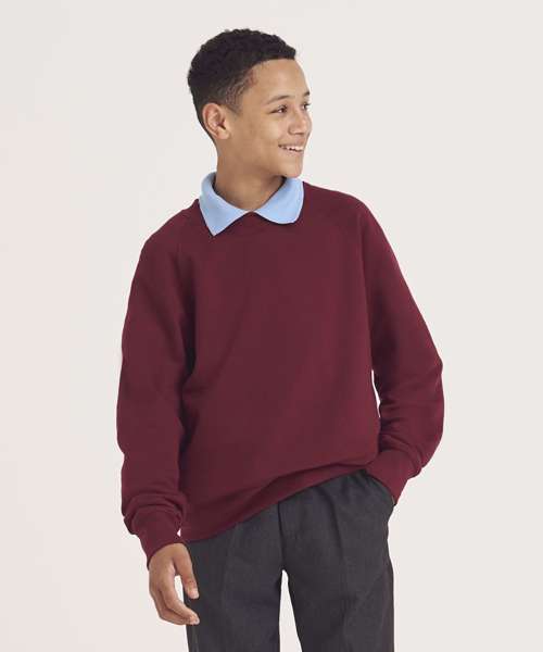 Crew neckline sweatshirt. Raglan sleeves. Ribbed neckline, cuffs and hemline. Soft cotton faced fabric creates ideal printing surface. Name label at back neck. Taped neck. Twin needle stitching for durability.