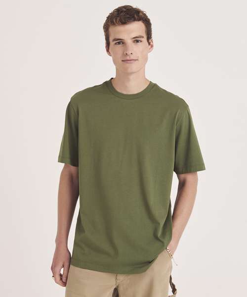 Relaxed fit T. Short sleeves. Side seams. PurePrint BC Cotton fabric. Taped back neck. Twin needle stitch details. Ribbed crew neck.