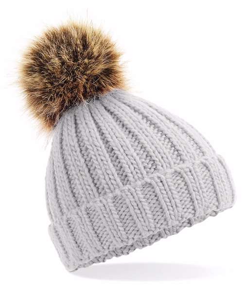 Tear-out label for ease of rebranding. Sumptuous heavy ribbed knit. Luxury faux fur pom pom. Non-removable pom pom for added safety. Cuffed design for optimal decoration. Unisex styling. Available in adult sizes. BSCI certified. Reach certified.