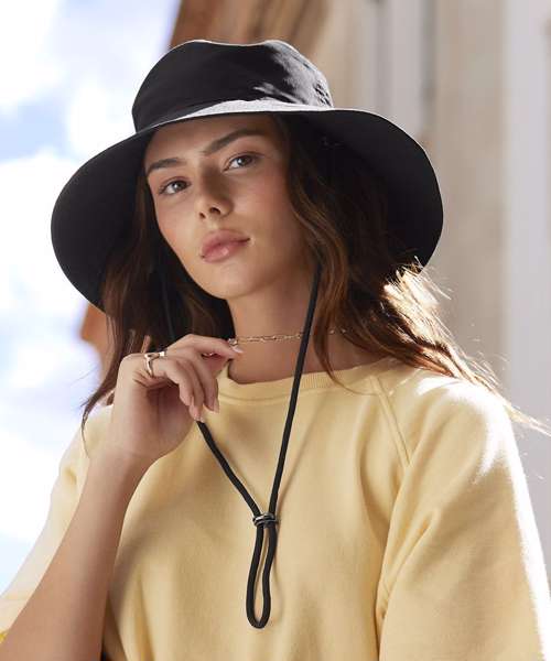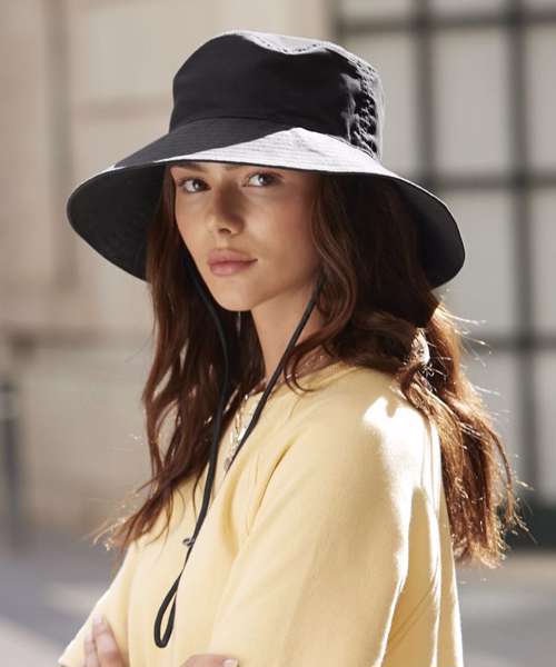 Contains 100% certified recycled nylon. Water-repellent fabric. Protection against sunlight: UPF50+. Wide-brimmed design. Adjustable chin strap. TearAway label for ease of rebranding.