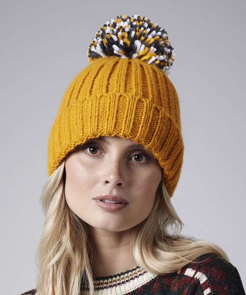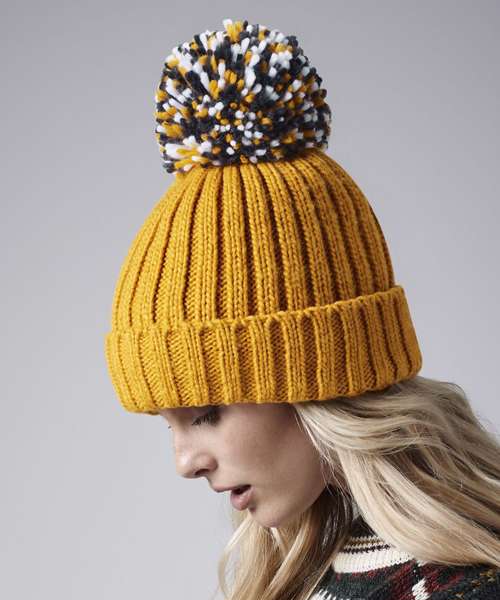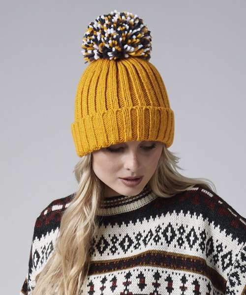 Heavyweight ribbed knit design. Luxury oversized pom pom. Luxurious Shearling lining for extra warmth. Cuffed design for optimal decoration. TearAway label for ease of rebranding. BSCI certified. Reach certified.