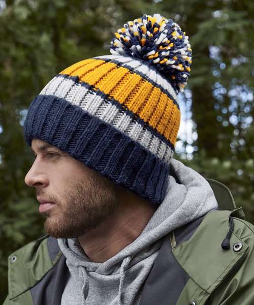 Heavyweight ribbed knit design. Bold three-colour stripe design. Luxury oversized pom pom. Luxurious Shearling lining for extra warmth. Cuffed design for optimal decoration. TearAway label for ease of rebranding. BSCI certified. Reach certified.