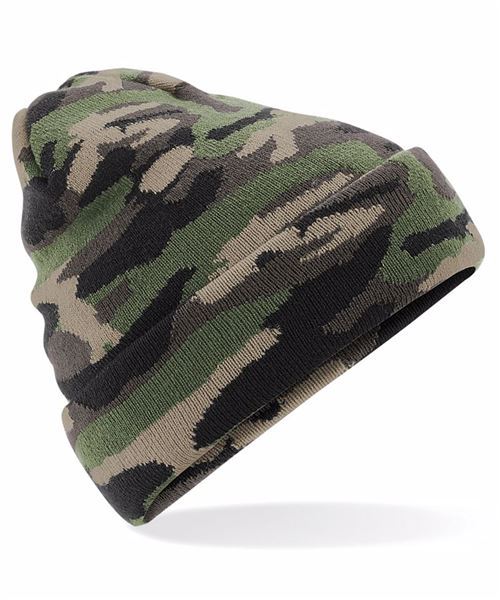 Tear-out label for ease of rebranding. Jacquard camo design. Double-layer knit. Cuffed design for optimal decoration. BSCI certified. Reach certified.