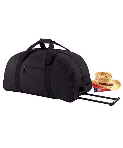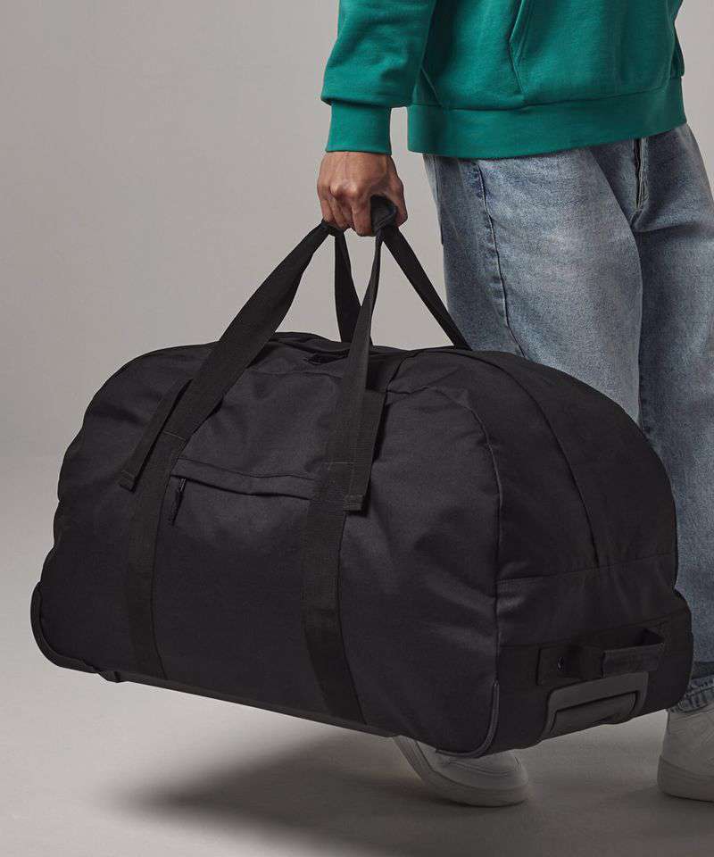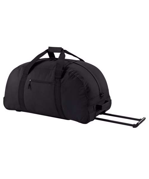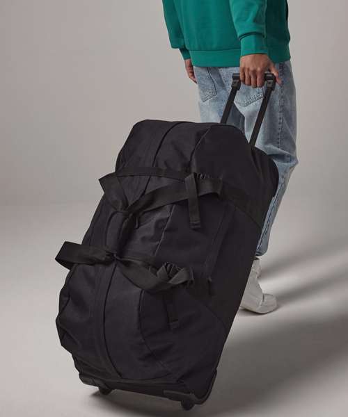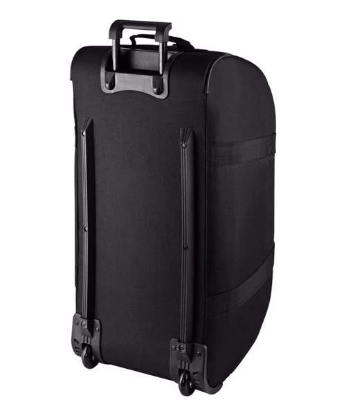 Detachable adjustable shoulder strap with pad, padded hand grip, compression straps. Zippered pouch pocket. Heavy duty handles. Durable integrated skate wheels. Grab handle. Retractable twin tube locking tow handle. Lockable main zip.