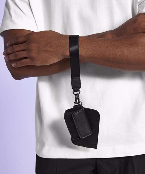 Saffiano fine grain. Three-piece product. Air pod case with a press-stud opening. Webbing wristlet strap. Zipped card wallet. High-shine gold metal trims. Compatible with bags and accessories from the Boutique Collection. TearAway label for ease of rebranding.