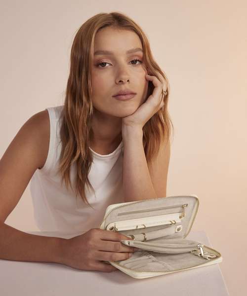 Protective velvet lining. Saffiano fine grain. Necklace compartment. Four secure necklace hooks. Detachable earring organiser. Ring holder. Two secure zip pockets. High-shine gold metal zip. Designed to store rings, earrings and necklaces.