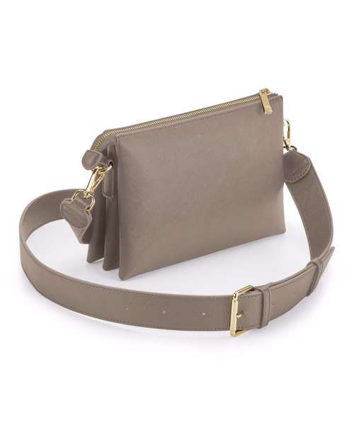100% Leather-look PU. Saffiano fine grain. Internal pockets and dividers. Zipped main compartment. Zipped internal valuables pocket. Soft-touch lining. High-shine gold metal zip. Detachable adjustable shoulder strap. TearAway label for easy rebranding.