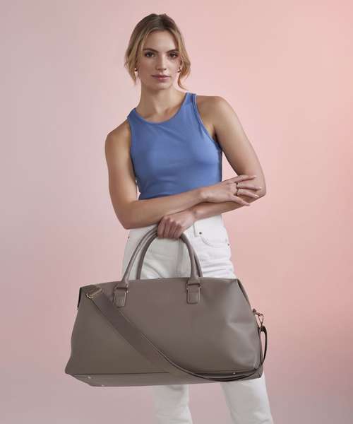 Saffiano fine grain. Extra-long main compartment zip for easy access. Zipped internal valuables pocket. Soft-touch lining. Internal baseboard. Protective base feet. High-shine gold metal zip. Self-fabric carry handles. Can be carried by hand or over the shoulder. Compatible with BG765 Boutique adjustable bag strap, Detachable, adjustable high-density webbing shoulder strap. TearAway label for ease of rebranding.