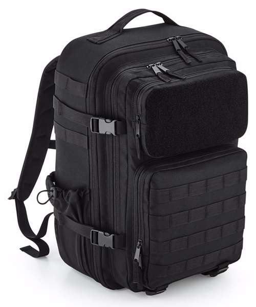 Military-inspired design. MOLLE webbing loop detail. Large main compartment. Padded laptop compartment, compatible up to 17". Full Rip-Strip™ front pocket for optimal decoration. Three large zipped front pockets. Dual tight-knit stretch mesh bottle pockets, capable of holding 750ml bottle shakers. Internal mesh pockets. Padded back panel. Large top carry handle. Compression straps. Ergonomically designed straps for everyday comfort. Fully adjustable chest strap. Compatible with Rip-Strip™ patches BG840 and BG841. Compatible with Modulr™ multi pockets BG241 and BG242. TearAway label for ease of rebranding.