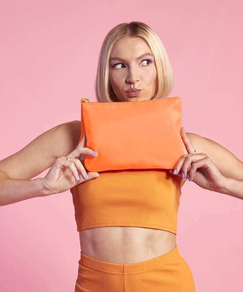 Premium fabric and finish. Bright colour pop palette. Zipped main compartment. Brushed gold metal zip and pull. Wristlet strap. Multipurpose use. TearAway label for ease of rebranding. Contains recycled polyester.