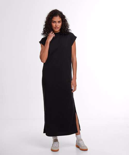 Loose straight fit. Dropped shoulders. Folded sleeve hem. Ends below the calf. Long side slits. High ribbed crew neck.