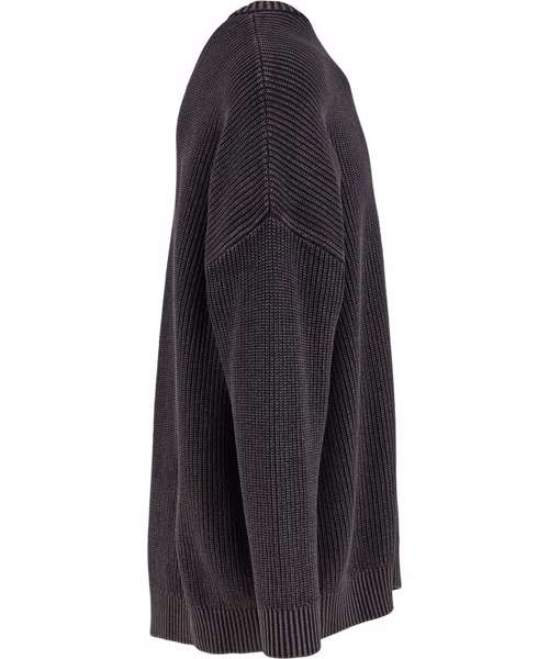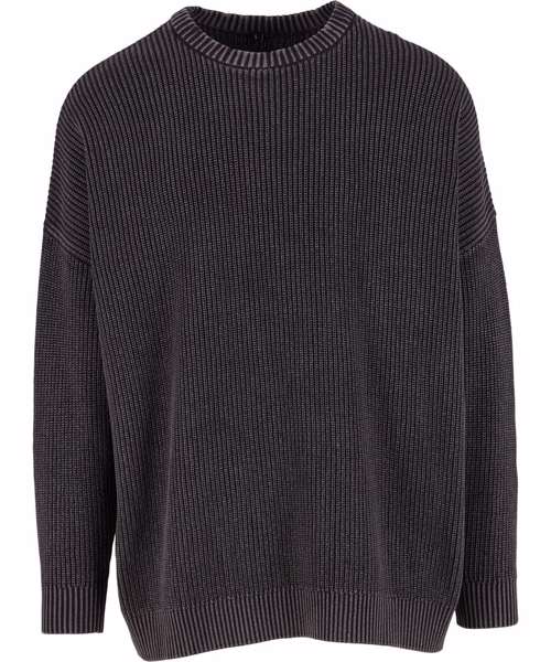 Oversized fit. Heavily dropped shoulders. Patent knit. Knit cuffs and hem. Acid wash.