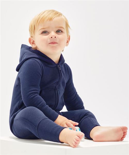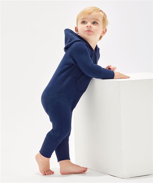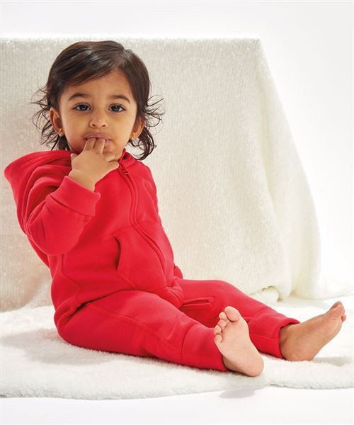 Baby and toddler All-in-one with cosy and soft brushed inner, and both 3 piece hood and extra-long cuffs (which can be folded back or left longer) for optimum fit. No centre back seam for increased decoration potential. Comfort tabs at top of zip. Oeko-tex® class 1 approved fabric. “Well-made” ethical manufacturing process. Brand-free back-neck area with tear off size and style label only. Oeko-Tex certified.
