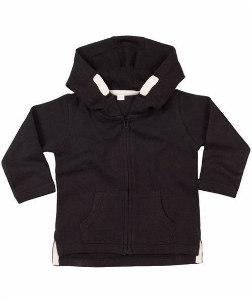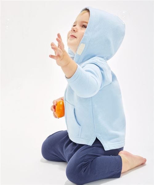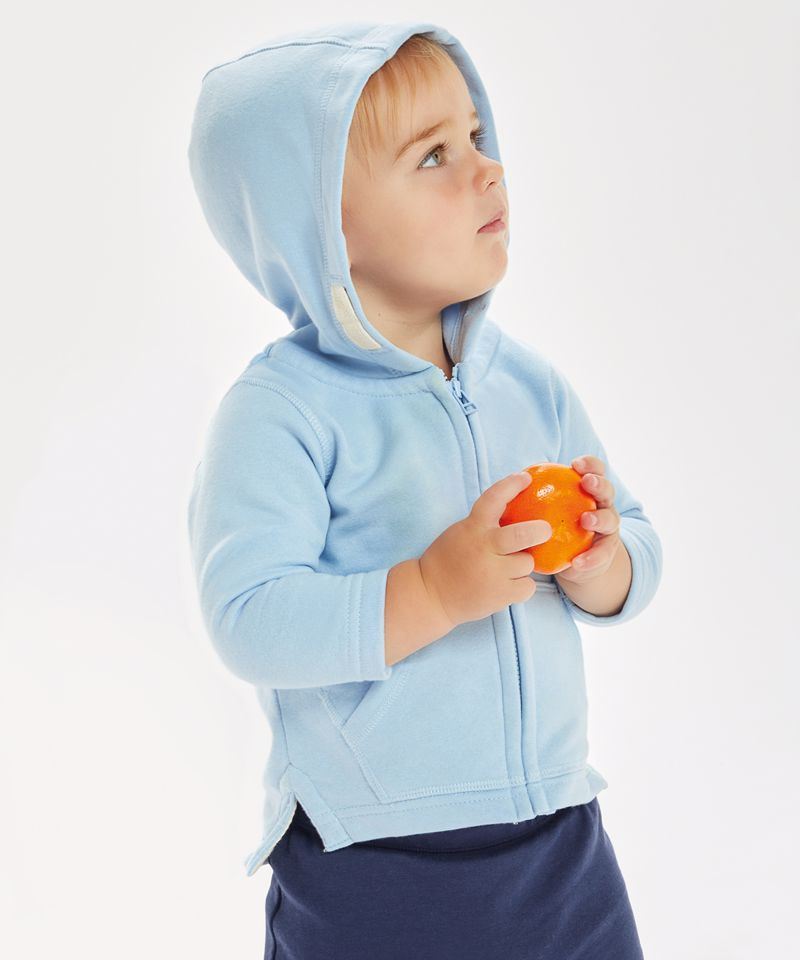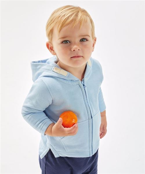 Soft, zip-through baby hoodie with brushed inner; 3-piece hood; kangaroo pockets and mock drawcord effect. Oeko-Tex certified.