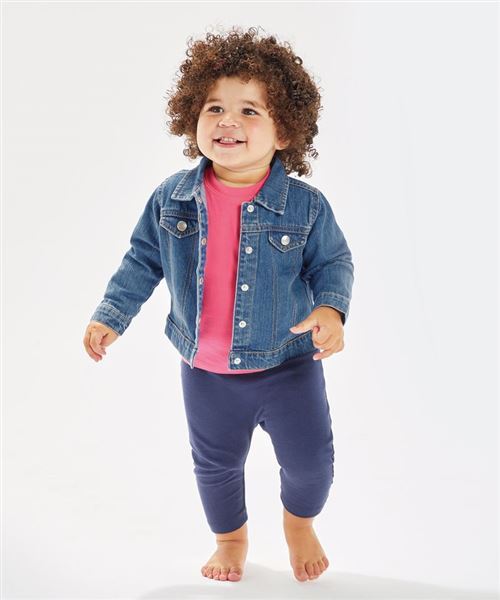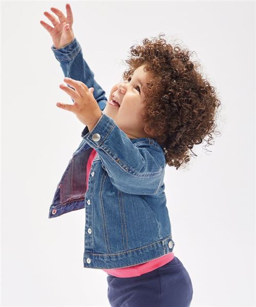 Baby denim jacket in organic cotton designed especially for decoration. Featuring front pocket flaps and mock-panel stitch detail, and 5-silver coloured poppers down placket. Waistband tabs on rear, poppers at cuffs and jeans-style, orange stitching for added authenticity and Tear-out label.