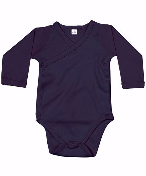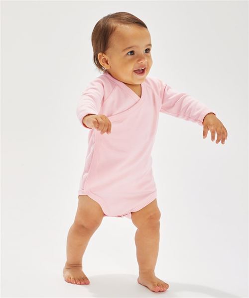 Wrap-over, kimono-style bodysuit. Nickel-free pop fasteners at side for ease of dressing. Nickel-free snap poppers at leg opening. Binding around neck, sleeve ends and leg openings for shape retention. Long raglan sleeves. Tear-off size label at back neck. Care label with QR code to follow supply chain and check positive impact of buying organic. Care label made from organic cotton. Oeko-Tex certified. Vegan certified. GOTS certified.