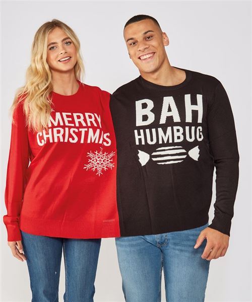 Cosy up with this festive fun 'twosome' Christmas jumper. One jumper wide enough for two people with opposing 'Merry Christmas' and 'Bah humbug' slogans you decide!.