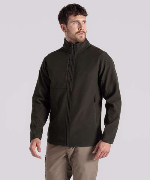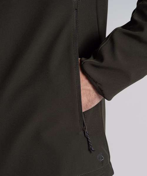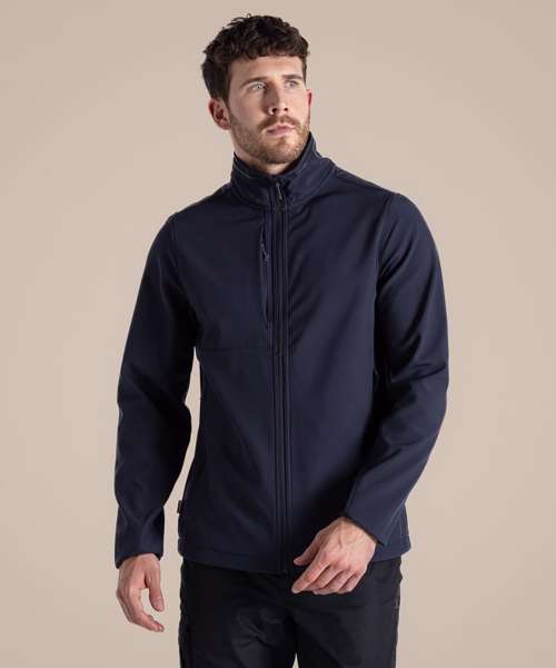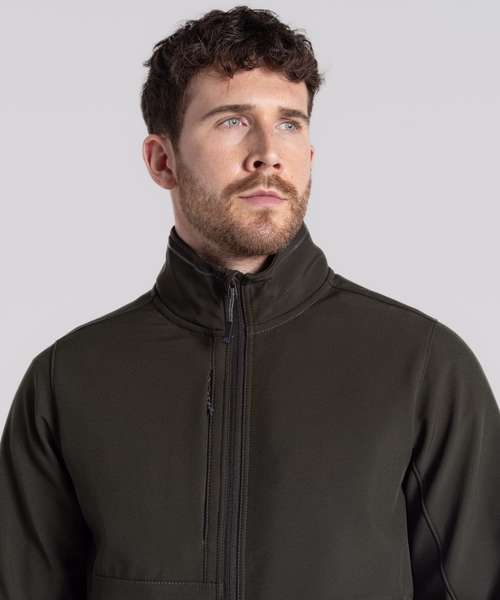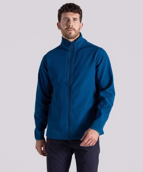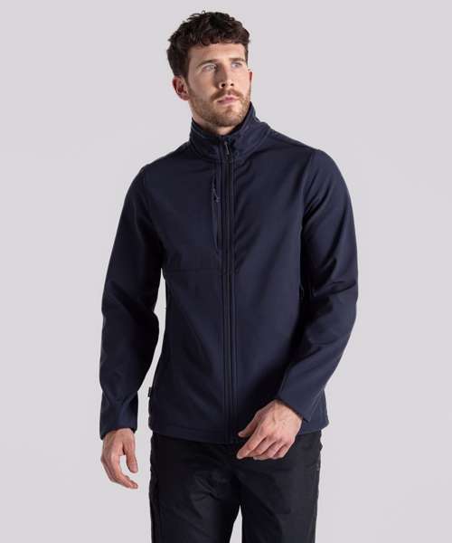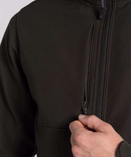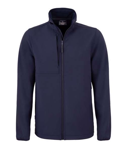 Water-resistant and windproof softshell jacket with 3 pockets. Recycled polyester elastane softshell with EcoShield DWR finish. Striped microfleece back and recycled zip tapes.