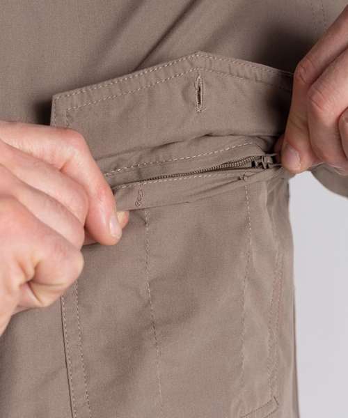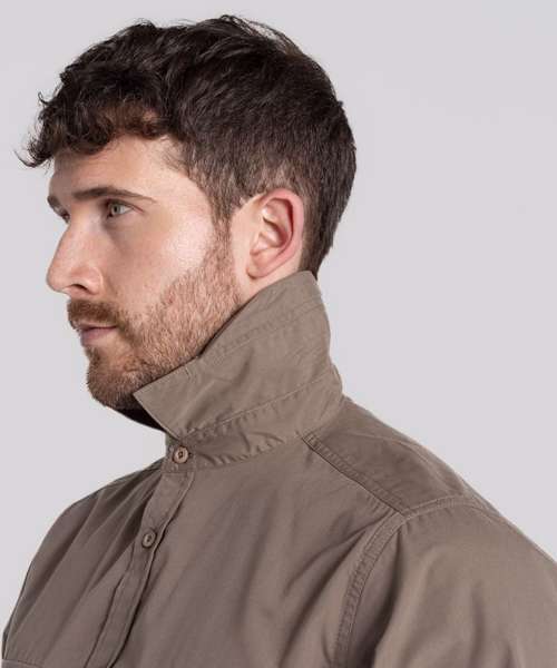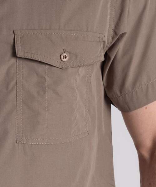 Short-sleeved shirt made with fabric too tough for insects to bite through. Recycled polyester cotton shirting and recycled zip tape. SolarShield collar. Nosi Defence technology.