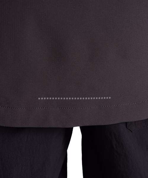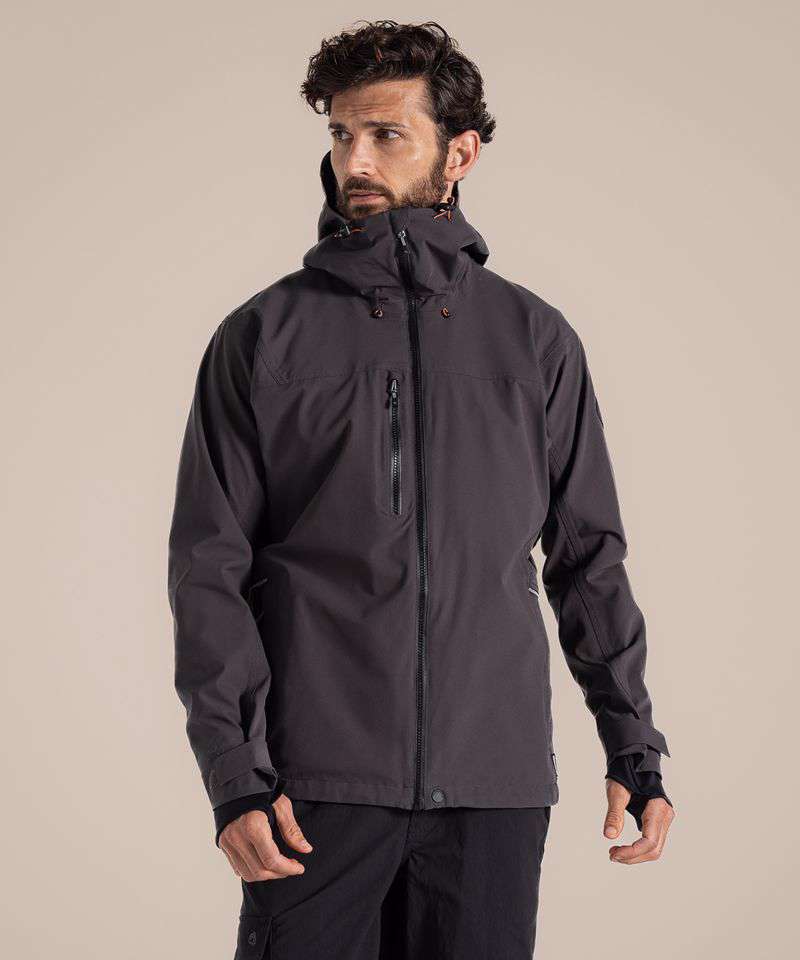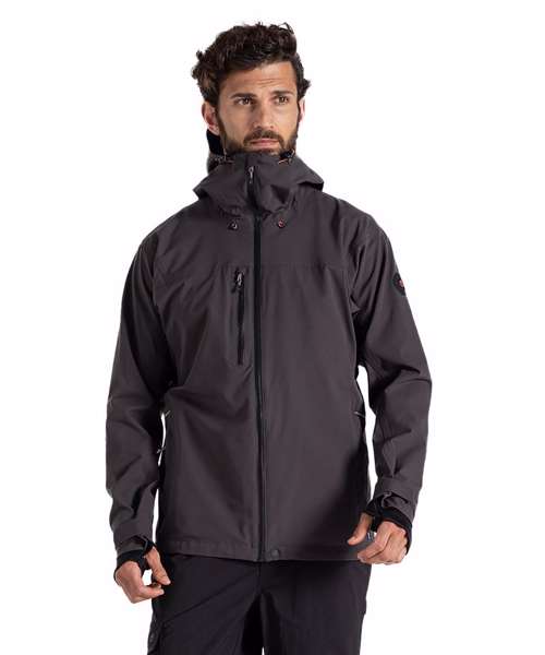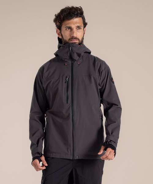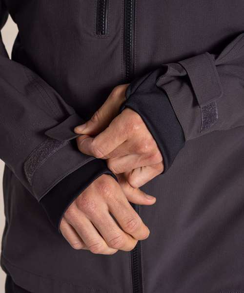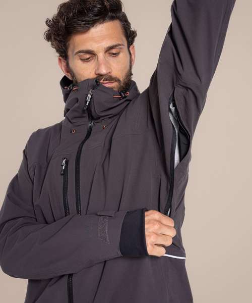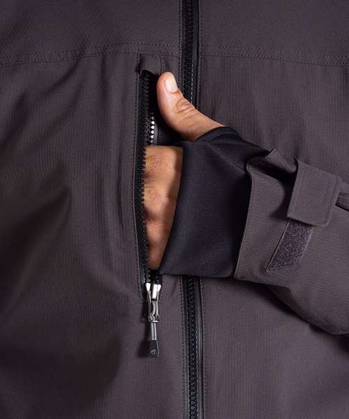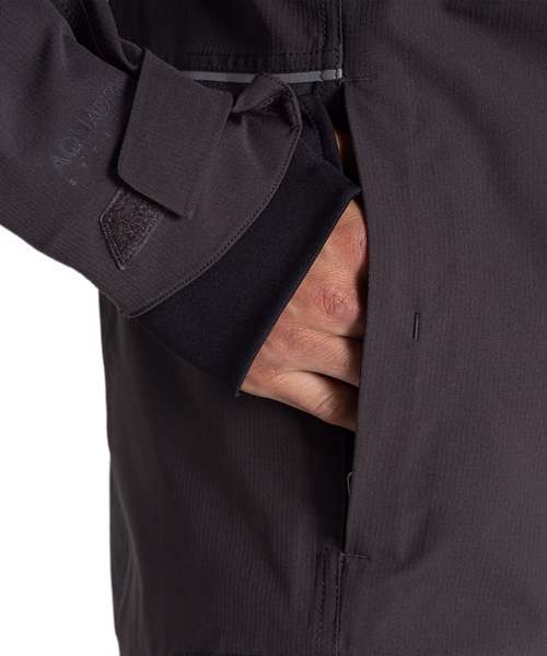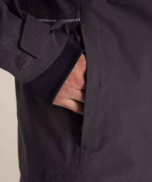 EN343-3.3 AquaDry membrane recycled polyester stretch ripstop with H2OShield DWR, polyester elastane stretch mesh and recycled polyester taffeta lining. Recycled zip tape to all zips except centre front and chest pocket zips. GRS certified fabrics, ETI factories, REACH compliant.