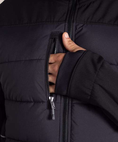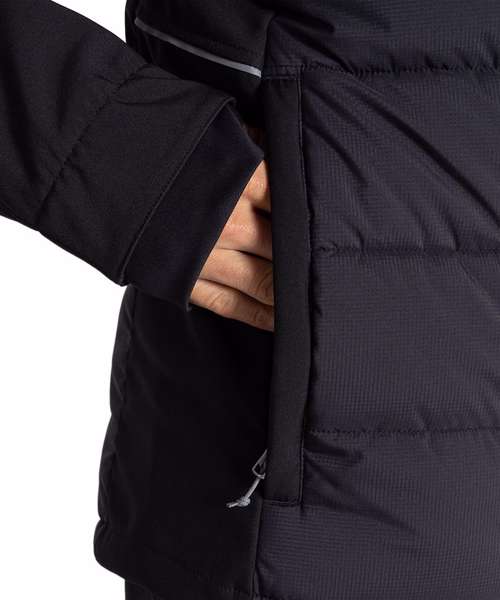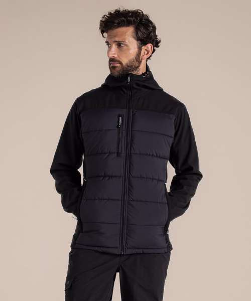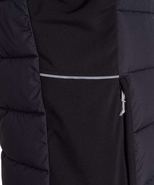 Part-recycled polyester elastane softshell with microfleece back and H2OShield DWR finish to upper body and hood. Part-recycled polyester ripstop to front and back body with H2OShield DWR finish, recycled polyester hollowfibre fill and recycled zip tapes.