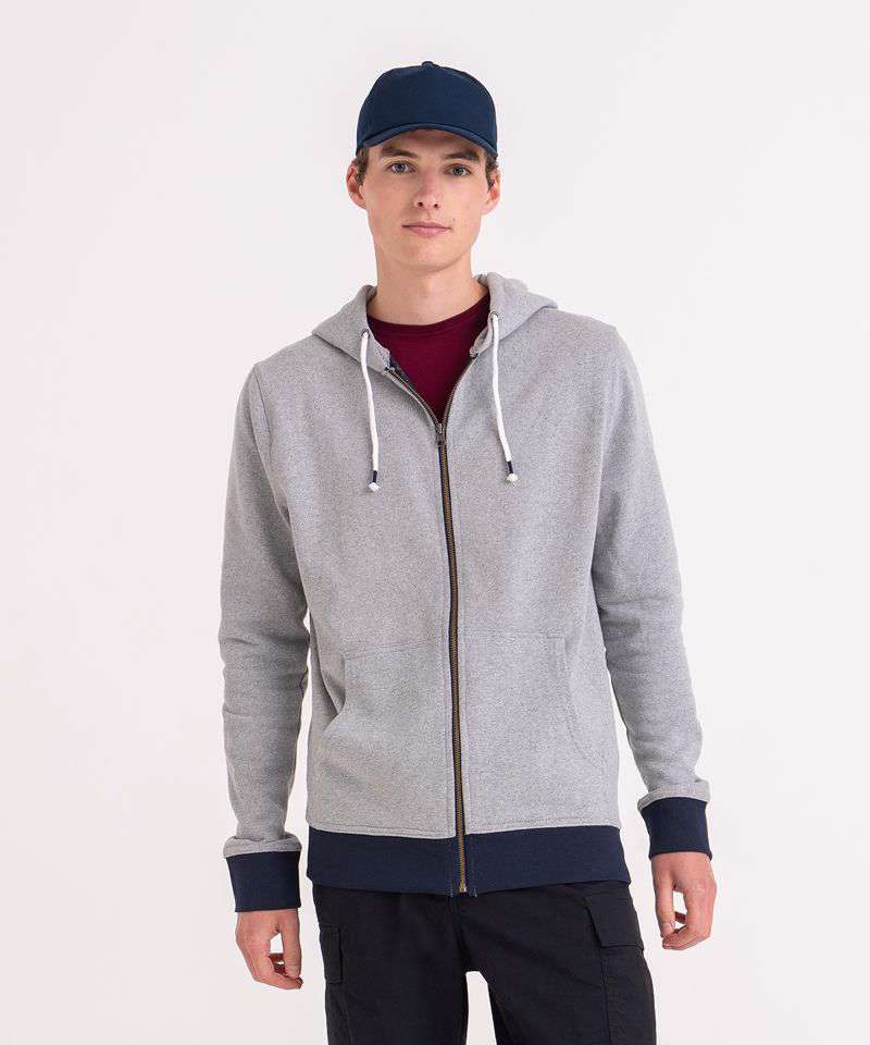 Long sleeve regenerated cotton zoodie with brushed inner and peached outer face. Features include set-in sleeves, contrast rib at cuffs hem, full length front zip and kangaroo pocket.