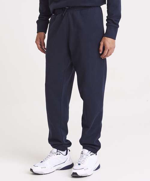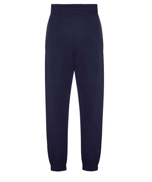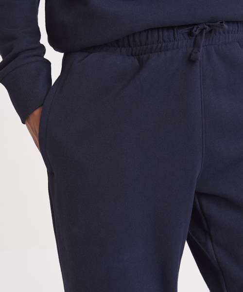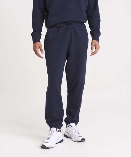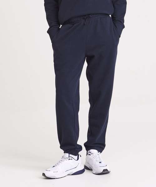 Relaxed unisex fit. 70% recycled cotton. Cuffed leg opening. Elasticated waist with DTM drawcords. Brushed inner fleece. Side pockets. Size tab only, for easy rebranding.