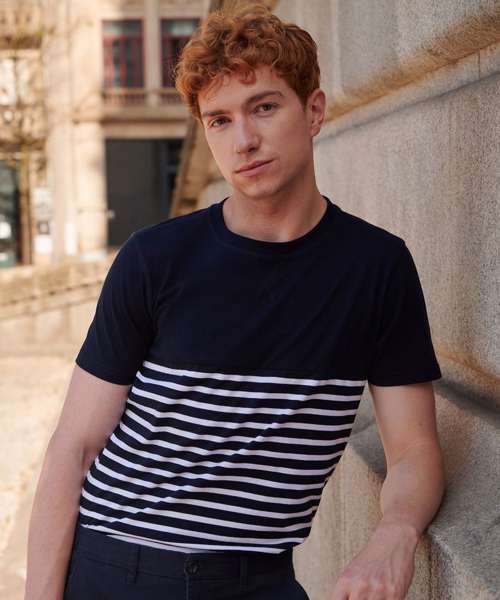 Tag free regular fit, heavyweight short sleeved t-shirt. Crew neck with stretch ribbed neckline. Twin-needle stitching at cuffs and hem. 'V' flatlock stitching detail at neck. Flatlock stitching at neck, shoulder seam and armholes. High chest seam. Striped lower body; contrast plain upper body and sleeves. Coordinates with FR134 long sleeved Breton T.