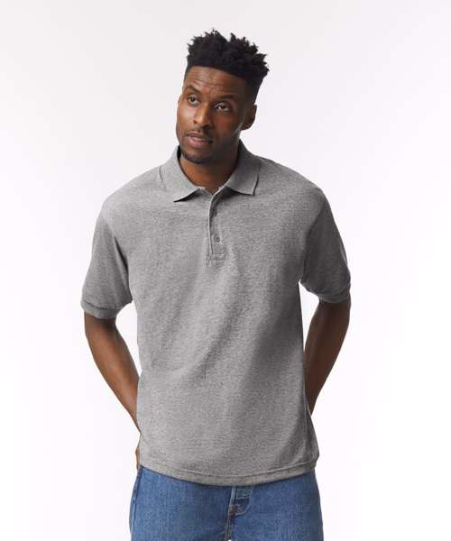 DryBlend® technology delivers moisture-wicking properties. Contoured welt collar and cuffs. Tearaway label. Clean finished placket with reinforced bottom box. 3 woodtone buttons. Twin-needle bottom hem.