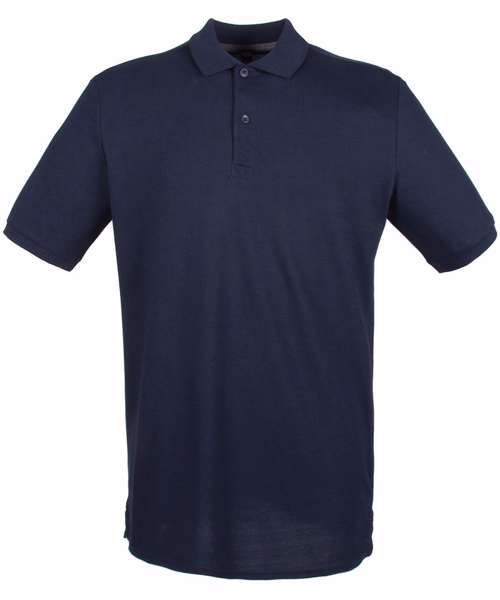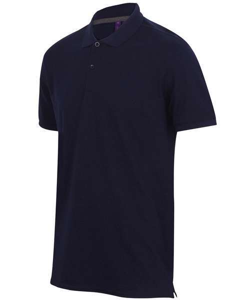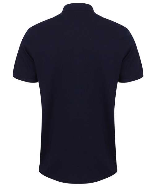 Modern-fit in a lightweight micro-fine piqué with a short point collar, fitted sleeve and cuffs for a modern and fresh new look. Micro-fine piqué is ideal for printing. 2 Button placket, Dyed to match buttons. Contrast herringbone tape in back neck and side vents. Henbury Cut-out back neck brand label.