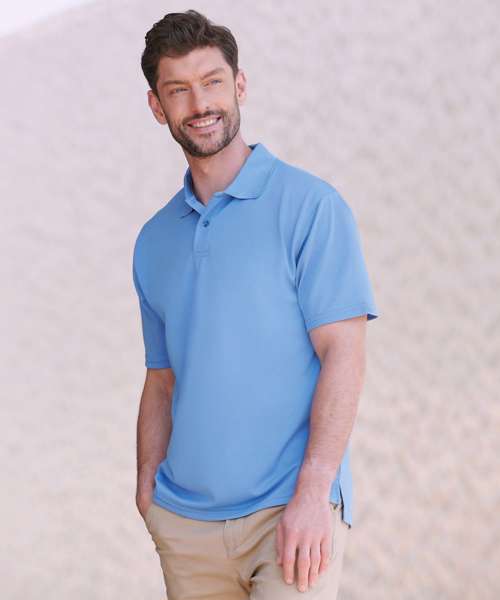 Men’s CoolPlus® wicking polo shirt. Micro piqué. Flat knit collar. Hemmed sleeves. Side vents for ease of movement. Wicking yarn for prolonged performance. Excellent colour retention. Minimum iron. Easycare.