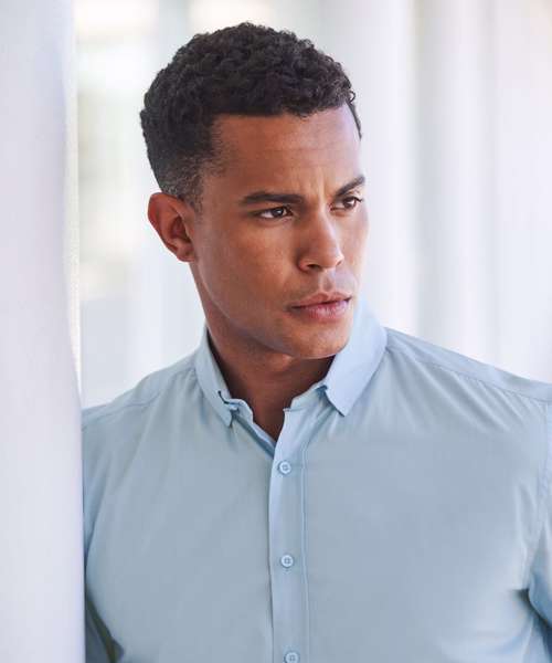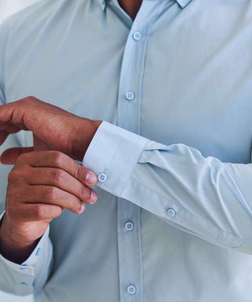A men’s long-sleeved shirt that feels like cotton and performs like polyester. The exclusive 100% Coolplus® polyester shirting fabric is the new functional formalwear, providing cool comfort, all day.