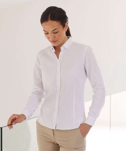 Women’s long sleeve ‘cotton-feel’ Coolplus® shirt, made from 100% Coolplus® permanent wicking fabric with cotton hand feel. Regular fit with shaped side seams. Front and back darts. Back yoke. Front placket with eight self-coloured pearlised buttons. Button-down collar. Adjustable cuffs. Tag-free. Wrinkle-resistant.