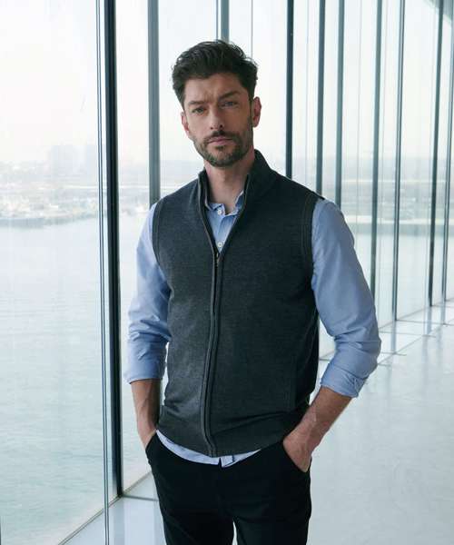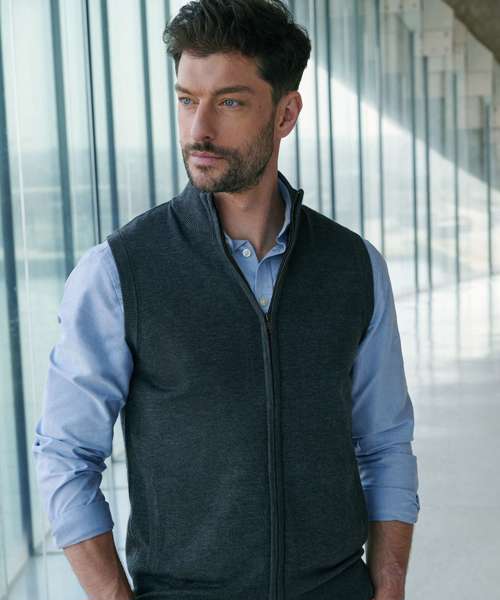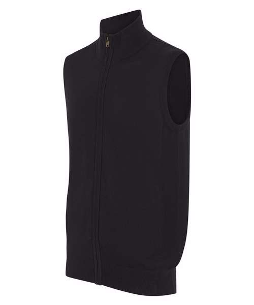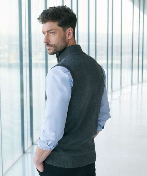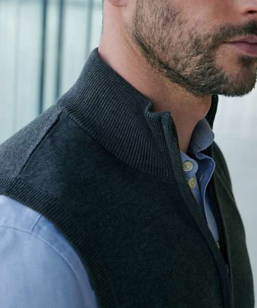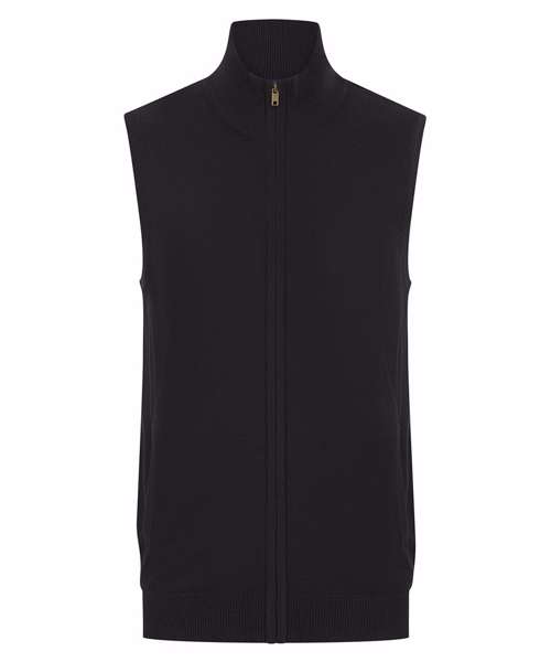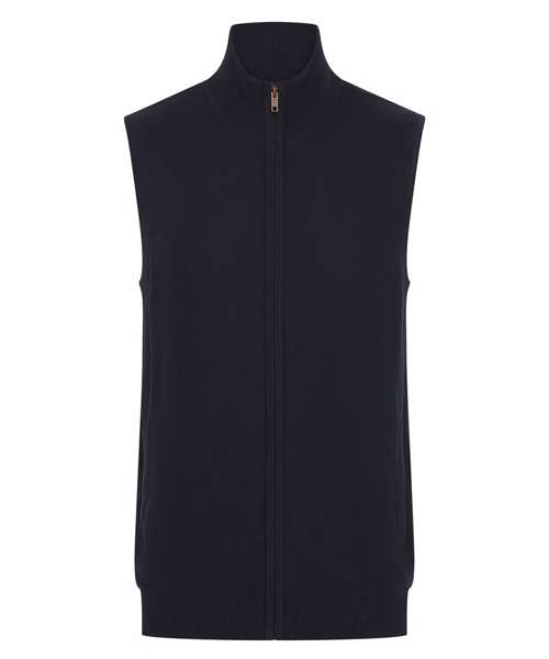 Men’s sleeveless zip-through jumper. Made from 50% cotton/50% acrylic, matching the Henbury knitwear collection. 12 gauge knitwear. Regular fit. Full-length front metal zip with covered placket. Two side welt pockets. Ribbed collar, hemline and armhole. Henbury cut-out label.
