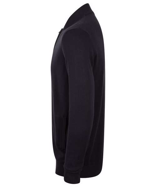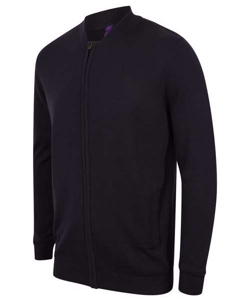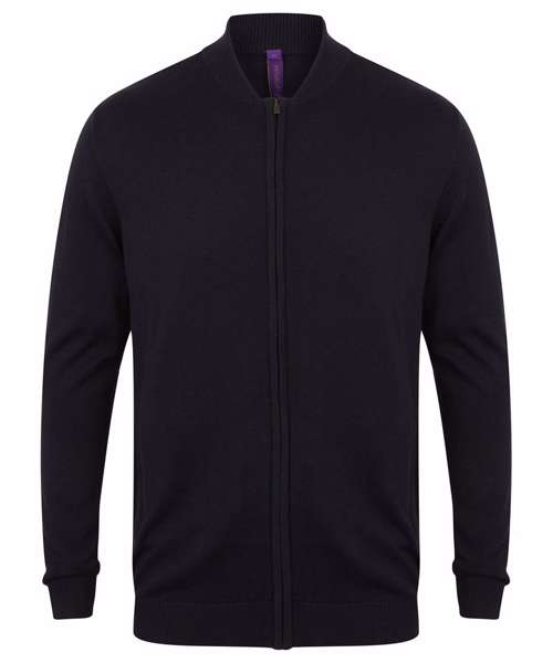 Fine knit, 12 gauge unisex bomber jacket. Semi-fashioned sleeve with full front zip opening. Metal zip and puller. 1x1 neck rib, hem and cuffs. Welted front pockets. Henbury cut-out brand label. Co-ordinates with HB720 product range.