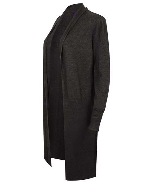 Fine knit, 12 gauge women's long line loose cardigan. Half ribbing detail on body and sleeves. Semi-fashioned sleeve. Henbury cut-out brand label. Co-ordinates with HB720 product range.