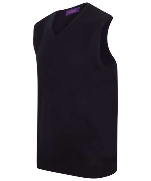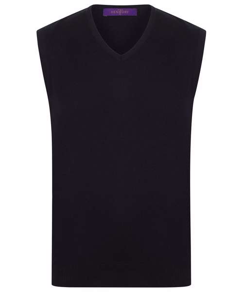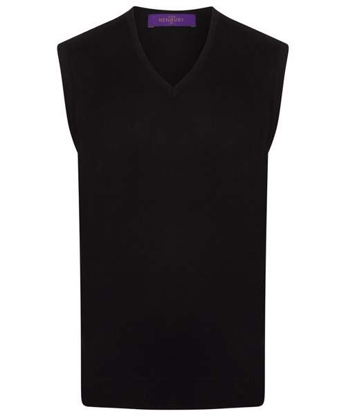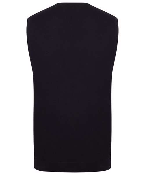 Fine knit. 12 gauge sleeveless v-neck jumper. Semi fashion neck detail. 1x1 rib and cuff.