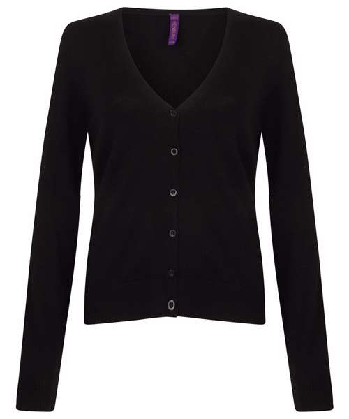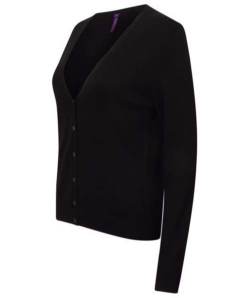 Fine knit 12 gauge short length cardigan. Semi-fashioned sleeve and neck detail. Self-coloured pearlised buttons. Set in sleeves. 1x1 neck rib, hem and cuffs. Co-ordinates with Men’s HB720, HB724, HB725 and Women's HB721. Henbury cut-out brand label.