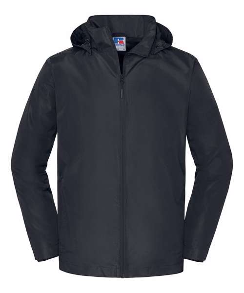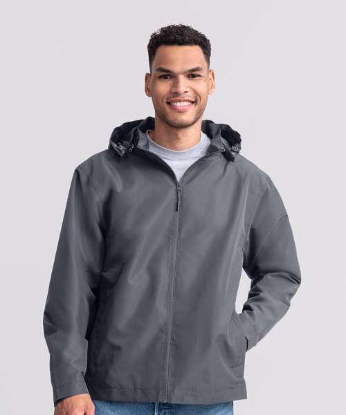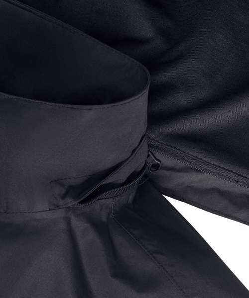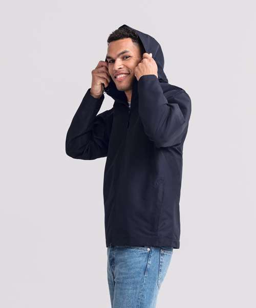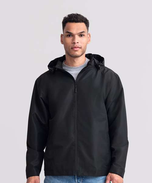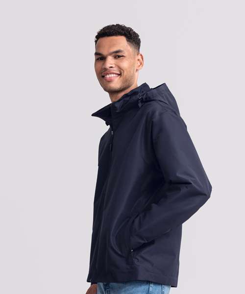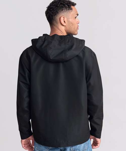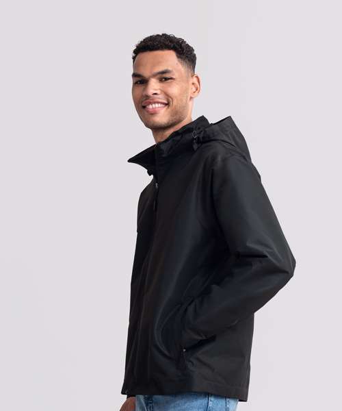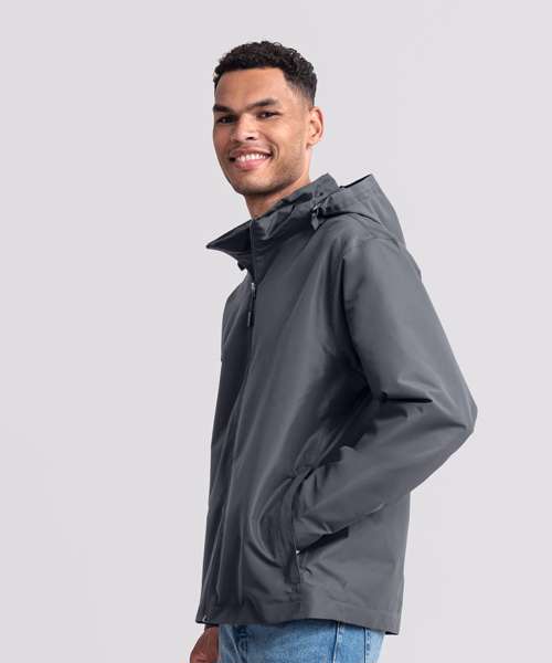Classic fit. Clean, minimalistic design. Two side pockets and one inside pocket. Adjustable three-part removable hood. Inside-out front zip with cord pull. Discreet decoration access at the hem. Breathable up to 2000g/m² per 24 hours. Waterproof material, minimum 2000mm. 100% Recycled polyester.