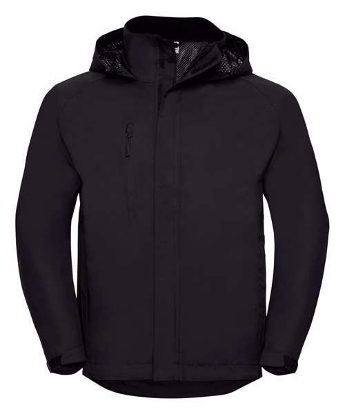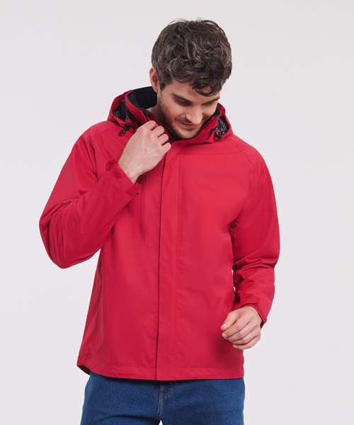 Water resistant garment. PU coated with critically taped seams, fabric is waterproof to 2000mm and breathable: 2000gsm per 24 hours. Active fit: articulated elbows, raglan sleeves and concealed hood. Advanced features include; zipped handwarmer pockets with internal pocket for phone/MP3, storm flap with rain channel, reversed zips and soft touch inner collar. Concealed 3 piece hood, fully lined with discreet concealed decoration access at hem.