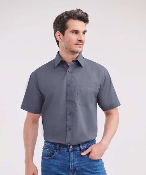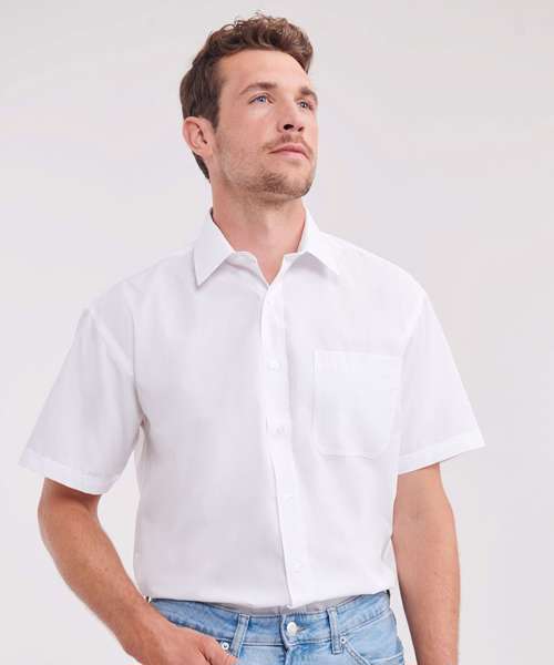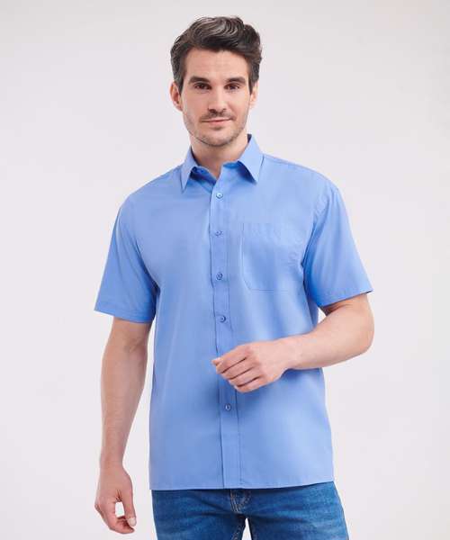 Smart and stylish shirt design in a fine poplin fabric. Classic style boned collar. Back yoke with 2 side pleats. Pocket over left chest mitred edge. Straight bottom hem. The elegant lightweight fabric is especially suited to finer embroideries.