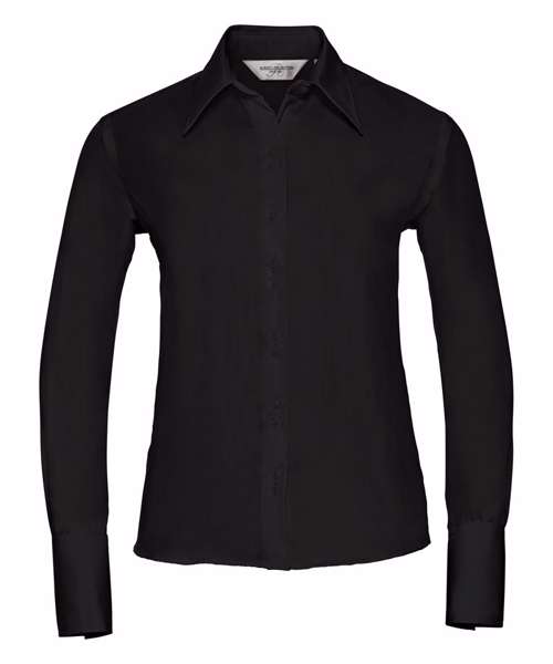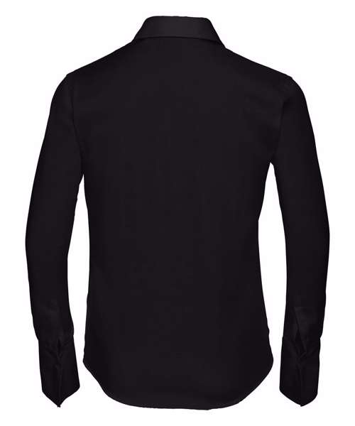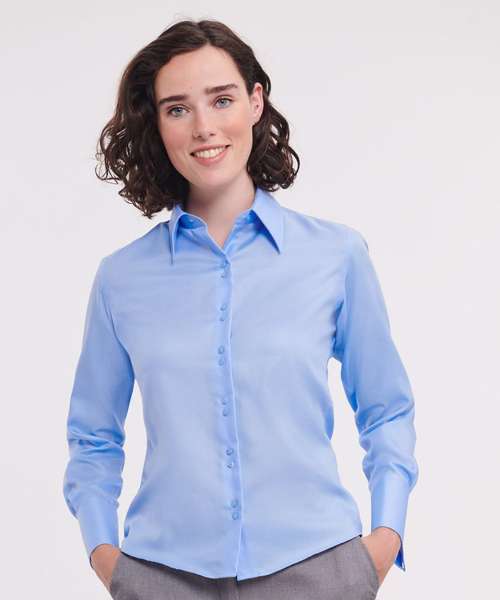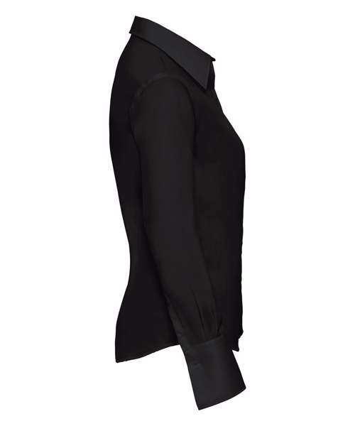 Made using the newest technologies of non-iron fabric that stays wrinkle free and keeps the wearer looking and feeling smart all day long. Contemporary fit combined with contemporary designed features. Stylish and relaxed long edged collar. Fashionable twin button fastening. Shaping at the waist for flattering feminine silhouette. Long, squared edge flared cuff with single button fastening and option for cuff links. Rounded hem.