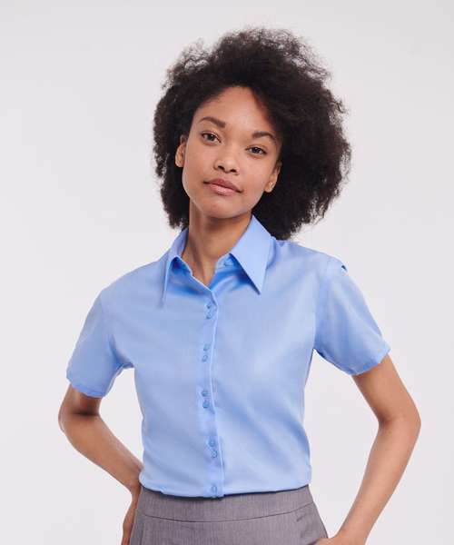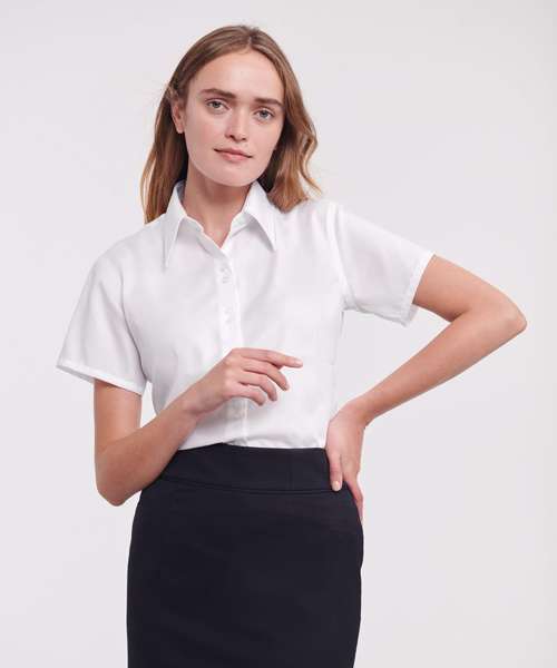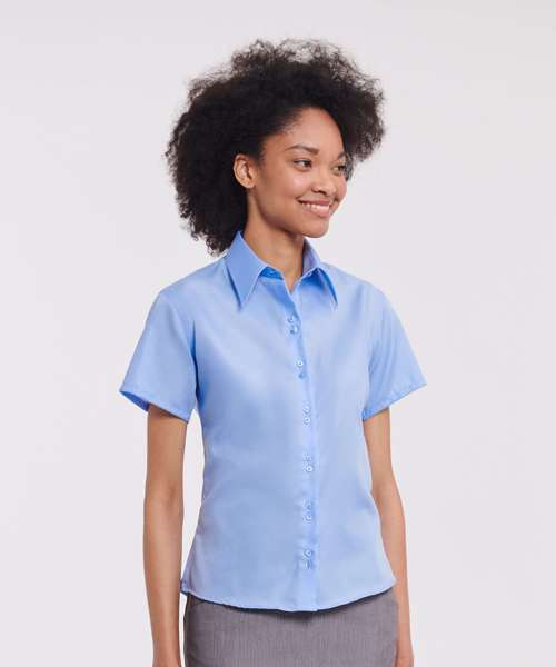 Made using the newest technologies of non-iron fabric that stays wrinkle free and keeps the wearer looking and feeling smart all day long. Contemporary fit combined with contemporary design features. Stylish and relaxed long edged collar. Fashionable twin button fastening. Shaping at the waist for flattering feminine silhouette. Rounded hem.