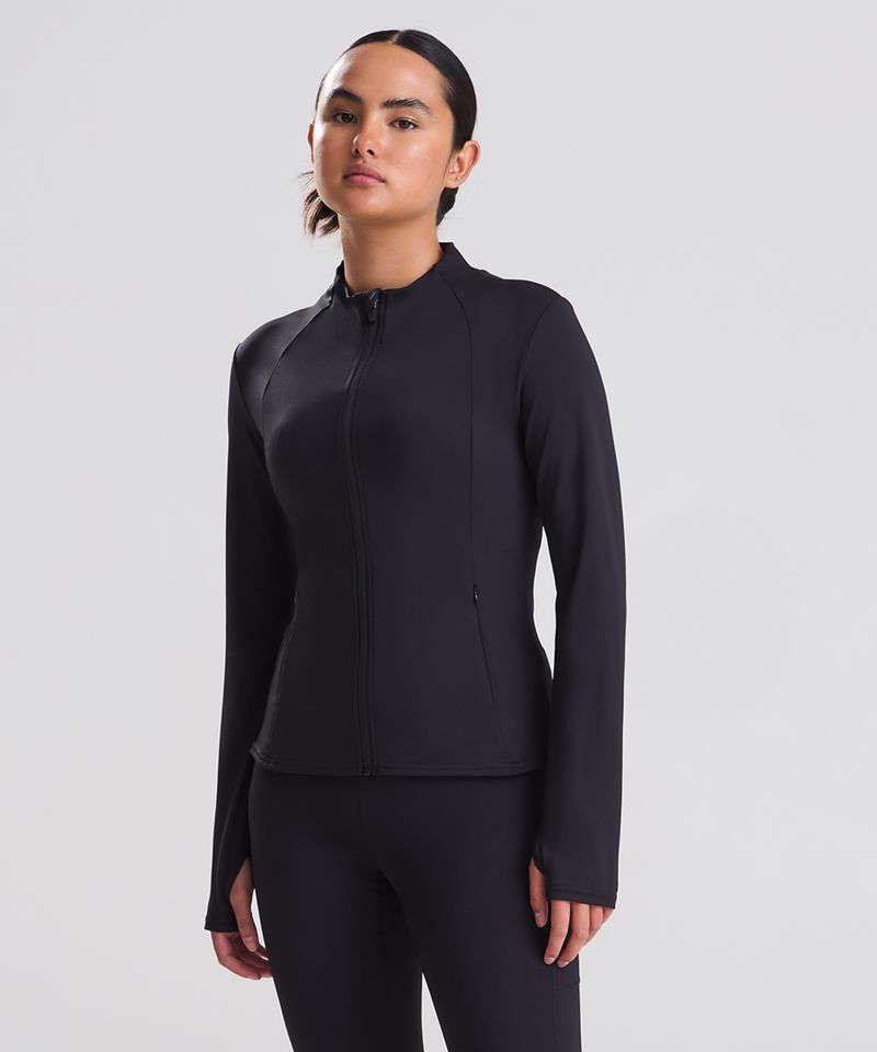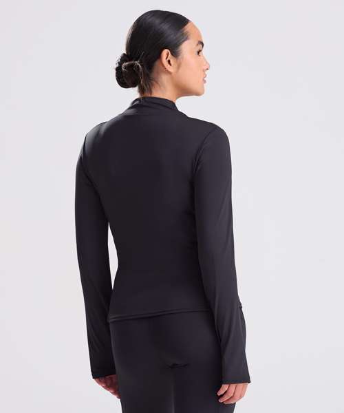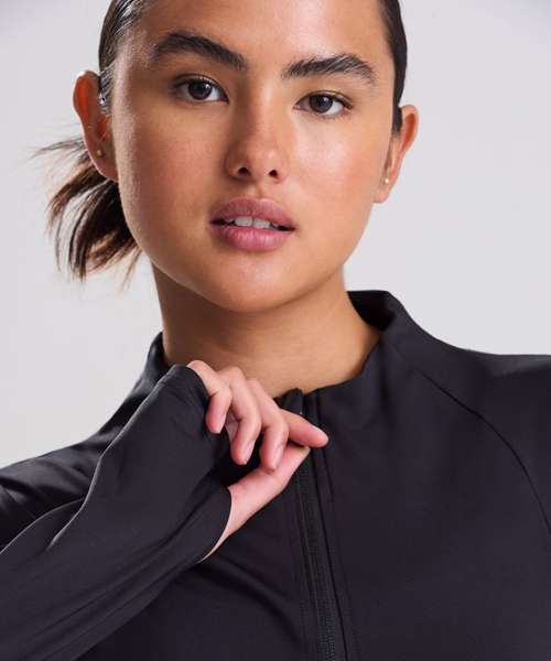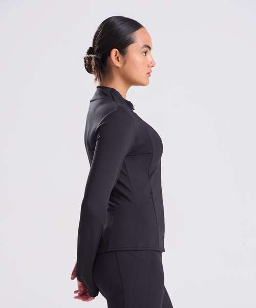 Slim fit. Four-way stretch fabric. Wicking, quick-dry fabric. Zipped pockets. Thumbholes on sleeves. Made with recycled polyester. Tear-away label.