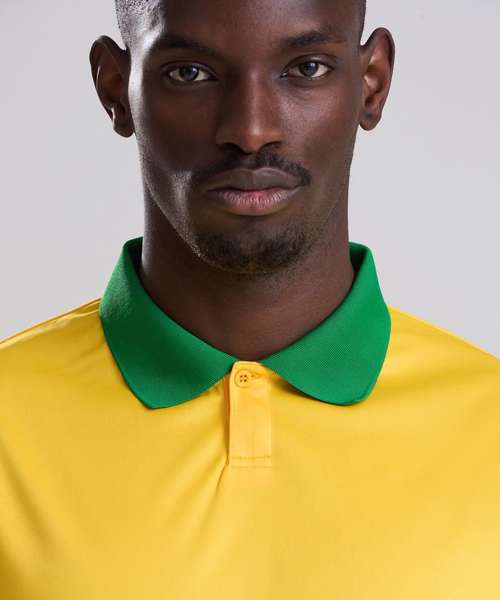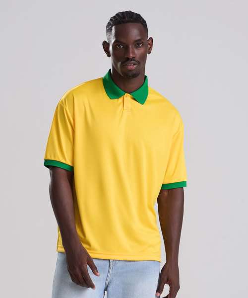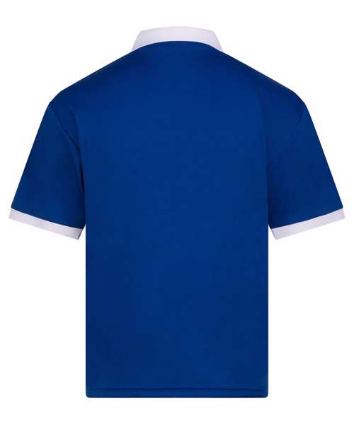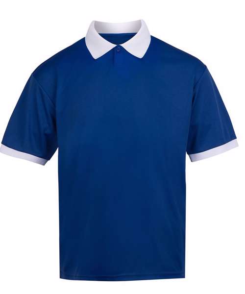 Relaxed fit. Contrast knitted collar. Tear-away label. Wicking fabric. White/Navy and Red/White options have retro-patterned printed fabric. Set-in sleeve.