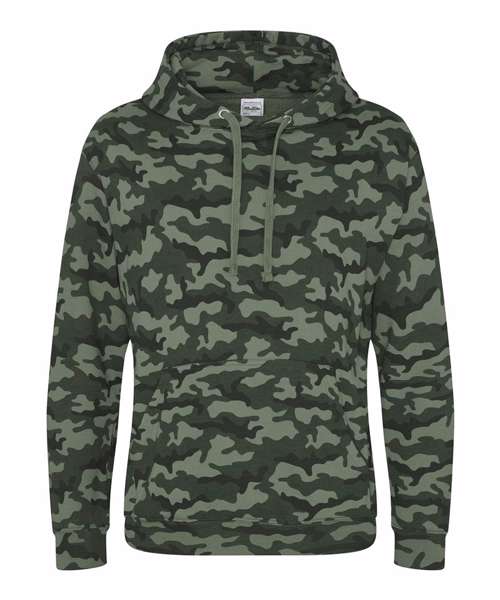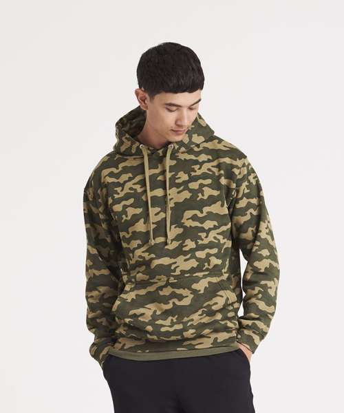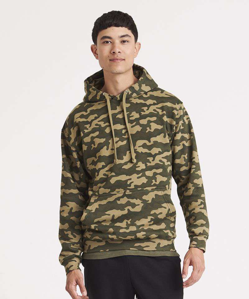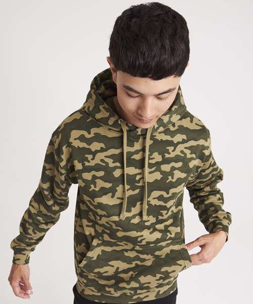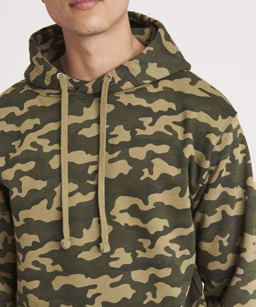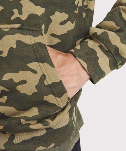 Twin-needle stitching detail. Classic all over camo print. Flat lace drawcords. Double fabric hood. Kangaroo pouch pocket. Ribbed cuffs and hem. Soft cotton faced fabric creates ideal printing surface. Simple tear-out label makes it perfect for rebranding. Flat lace drawcords. Brushed inner fleece.