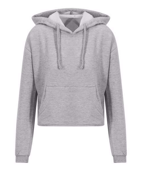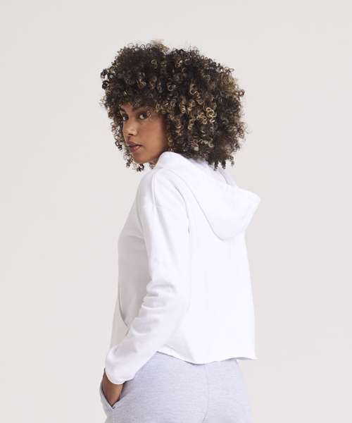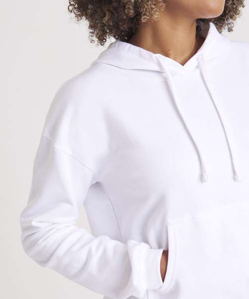 Girlie relaxed fit. Cropped cut with drop shoulder design. Kangaroo pouch pocket. Twin-needle stitching detail. Raw edge hem with cover stitching. Double fabric hood. Flat lace drawcords. Soft cotton faced fabric creates ideal printing surface. Simple tear-out label makes it perfect for rebranding. Brushed inner fleece. WRAP certified. SEDEX certified. Vegan certified.