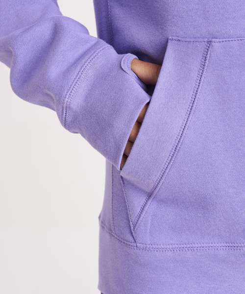 Heavyweight hoodie. Cross over neck detail. Twin needle stitching detail. Three panel double fabric hood. Flat lace drawcords. Kangaroo pouch pockets. Ribbed cuffs and hem. Soft cotton faced fabric created ideal printing surface. Simple tear out label makes it perfect for rebranding. Brushed inner fleece. Thumb holes in the cuffs.