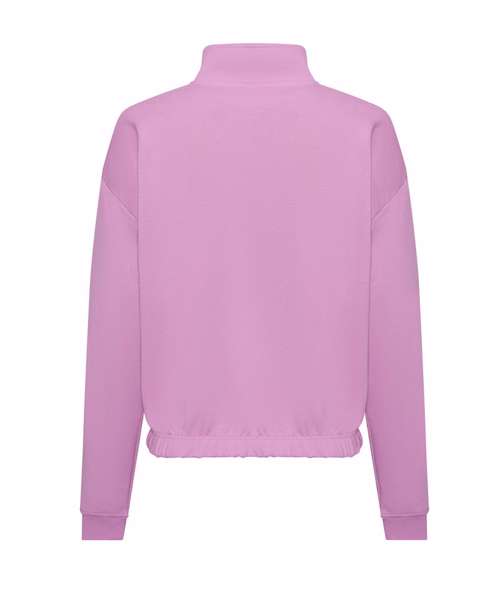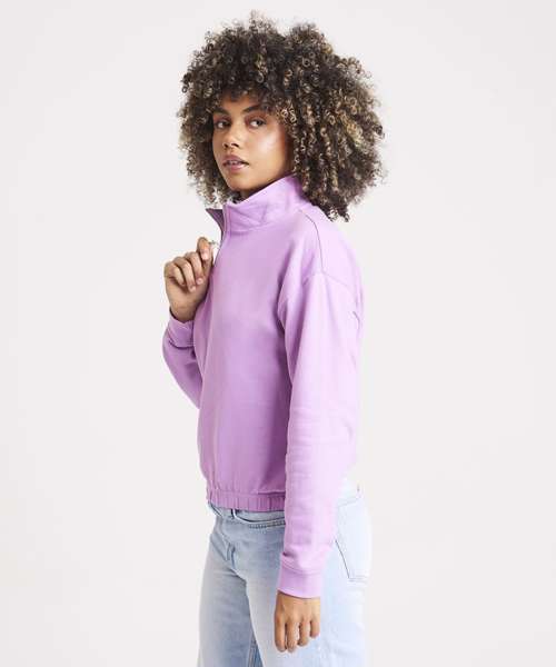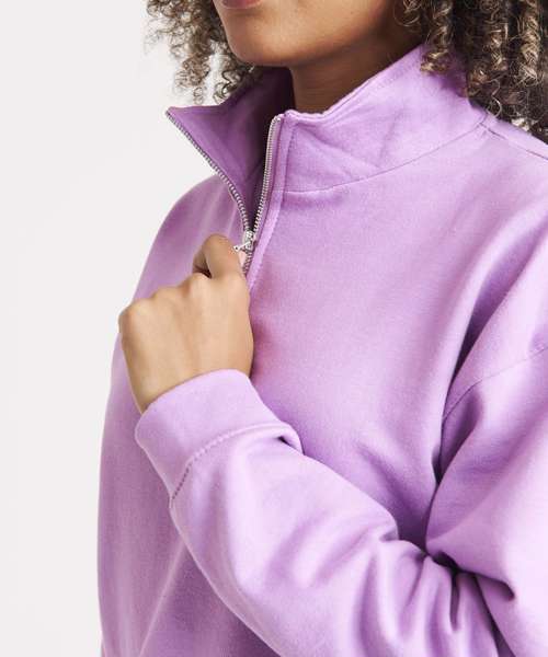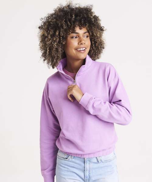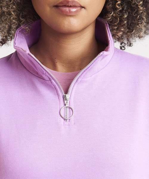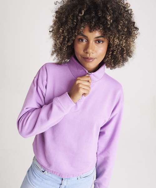 Women's regular fit. Funnel Neck. Quarter zip fastening. Cropped style. Elasticated hem. Brushed Inner fleece. Ribbed cuffs. Soft cotton faced fabric creates ideal printing surface. Simple tear out label makes it perfect for rebranding.