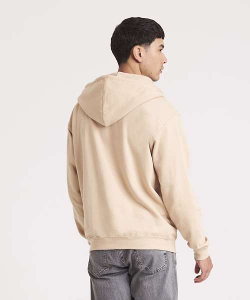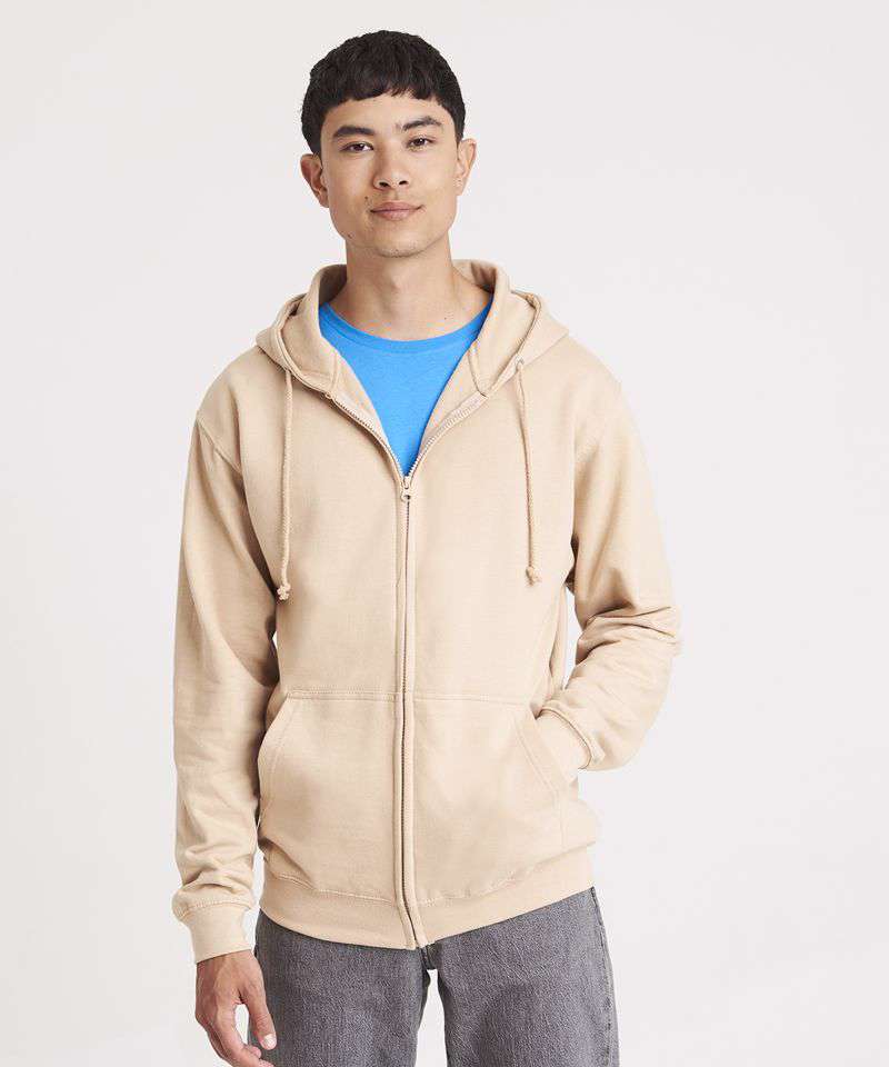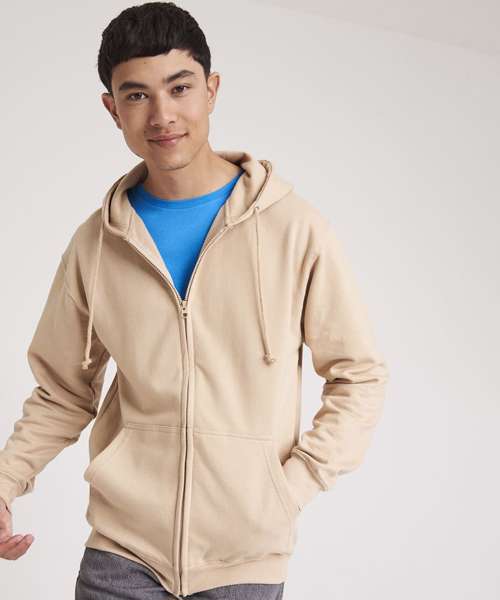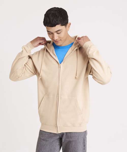 Full zip hoodie with a covered main zip with self fabric. Twin needle stitching detailing and double fabric hood with self coloured cords and kangaroo pouch pocket. Ribbed cuff and hem and self coloured twill tape puller. Soft cotton faced fabric creates ideal printing surface. Simple tear out label makes it perferct for rebranding. Brushed inner fleece.